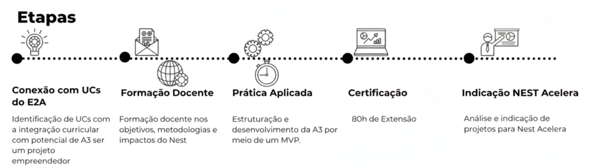 Assim, desde sua conexão com a unidade curricular, até a possibilidade de continuidade, a UC NEST acompanha todo o semestre letivo, como um elemento conectado à condução da UC designada. Não há alterações de ementa e conteúdo programático.