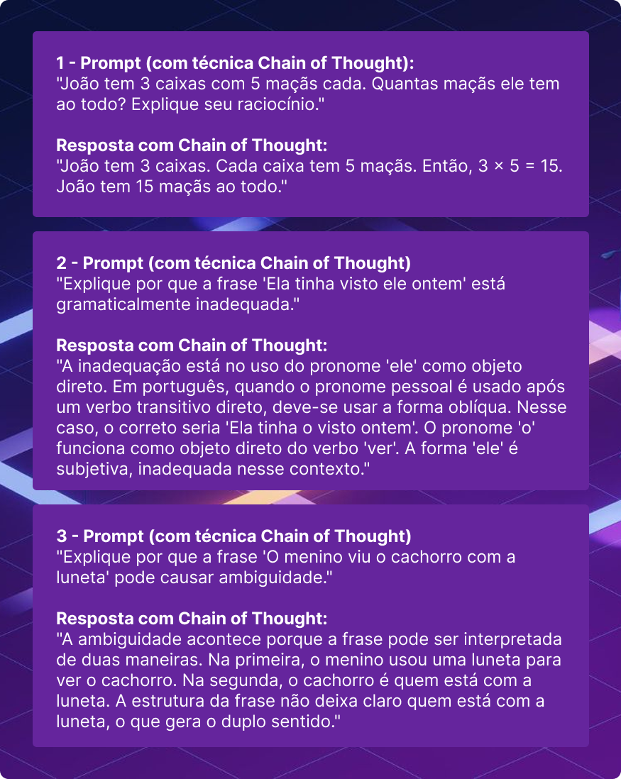 O Chain of Thought é uma técnica de prompt que estimula a IA a mostrar seu raciocínio passo a passo, tornando as respostas mais claras e detalhadas.