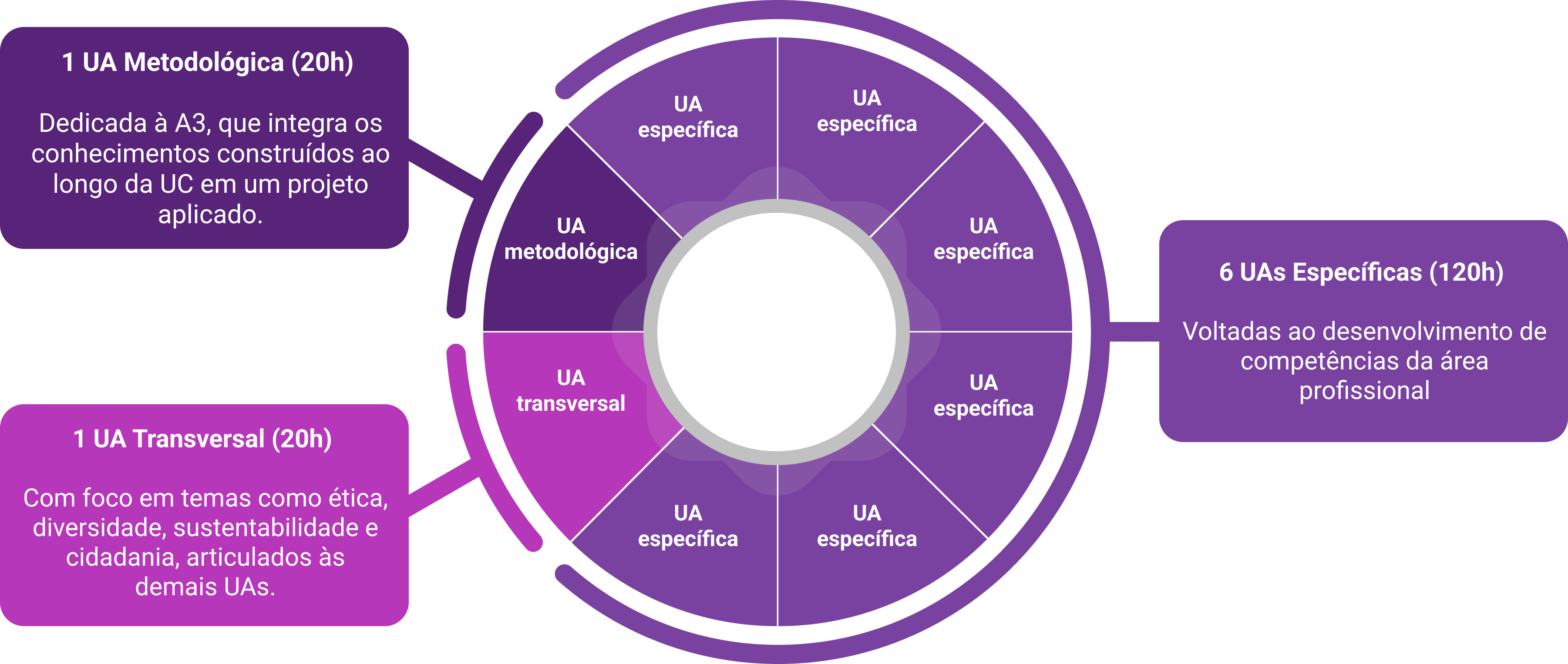 Cada UA corresponde a 20 horas e constitui a menor unidade curricular, consolidando os princípios de integração, flexibilidade e foco em competências.